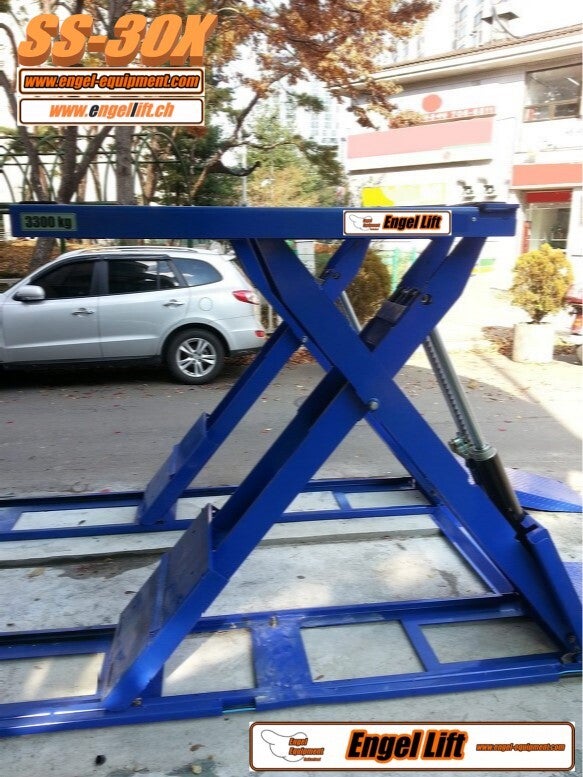 Engellift SS-30X : Pont élévateur à ciseaux en X avec plateforme courte (3.000 kg.), modèle à montage au sol.
