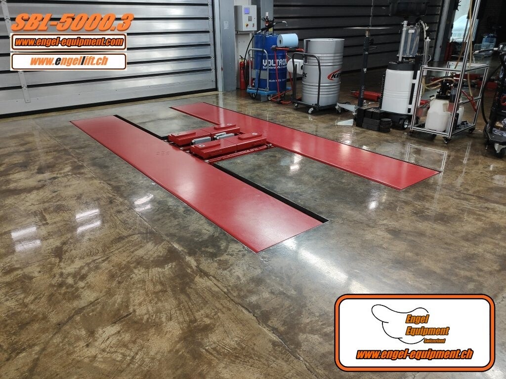Engellift SBL-5000.1 ; Pont élévateur à vérin sous le plancher, chemin de roulement plat Version = SANS vérin d'essieu (2ème niveau), SANS plaque tournante, SANS plaques coulissantes à l'arrière, SANS plaque de base follow-moving