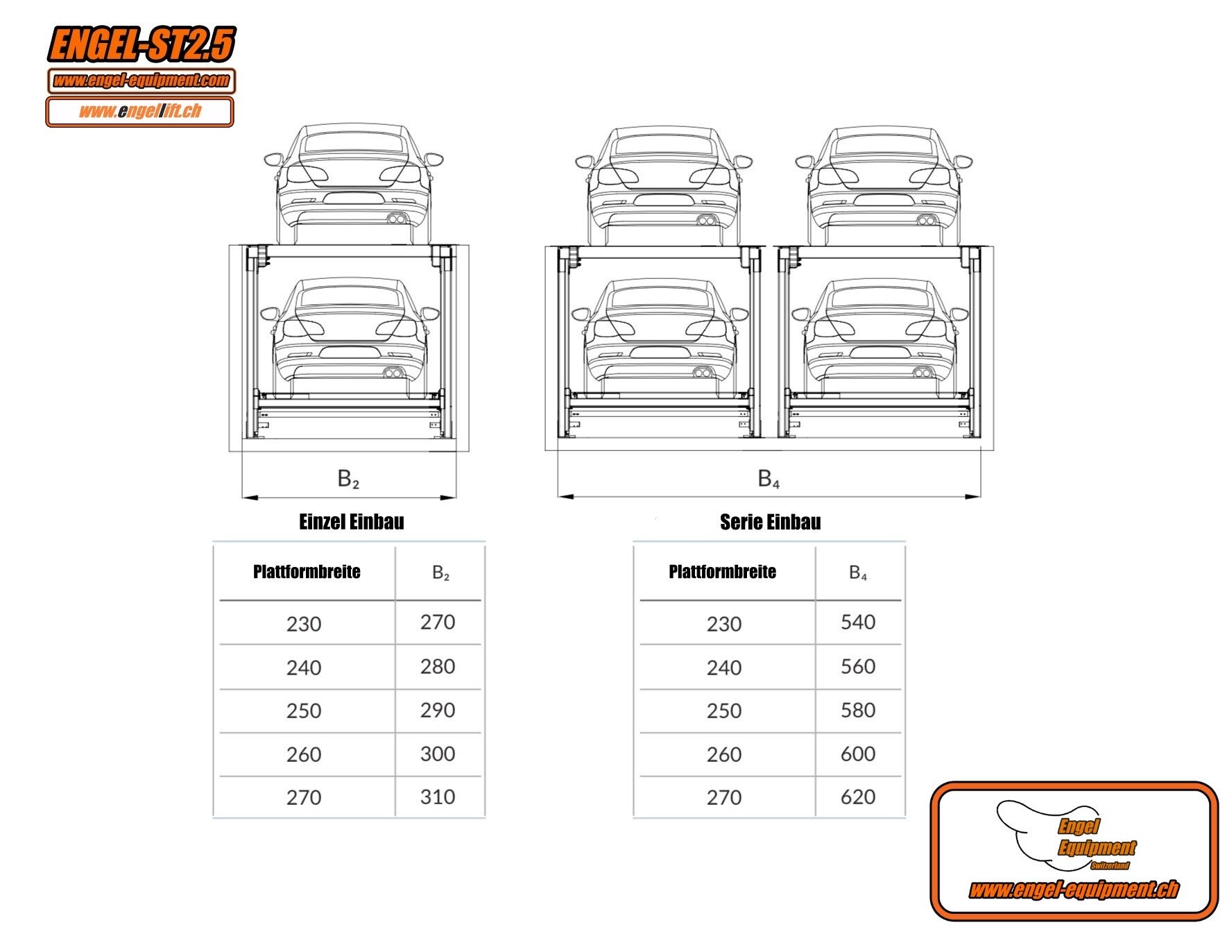 Il s'agit d'un de nos élévateurs de parking double à 4 colonnes, vous avez l'avantage avec ce modèle de pouvoir vous déplacer sous terre, donc spécialement conçu pour l'installation en sous-sol, ce modèle existe aussi en tant que plateforme de parking simple (ENGEL-ST2.5).